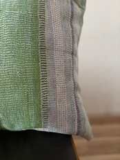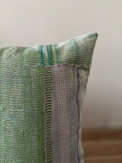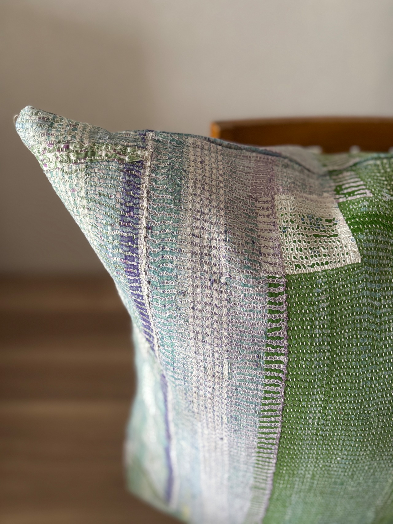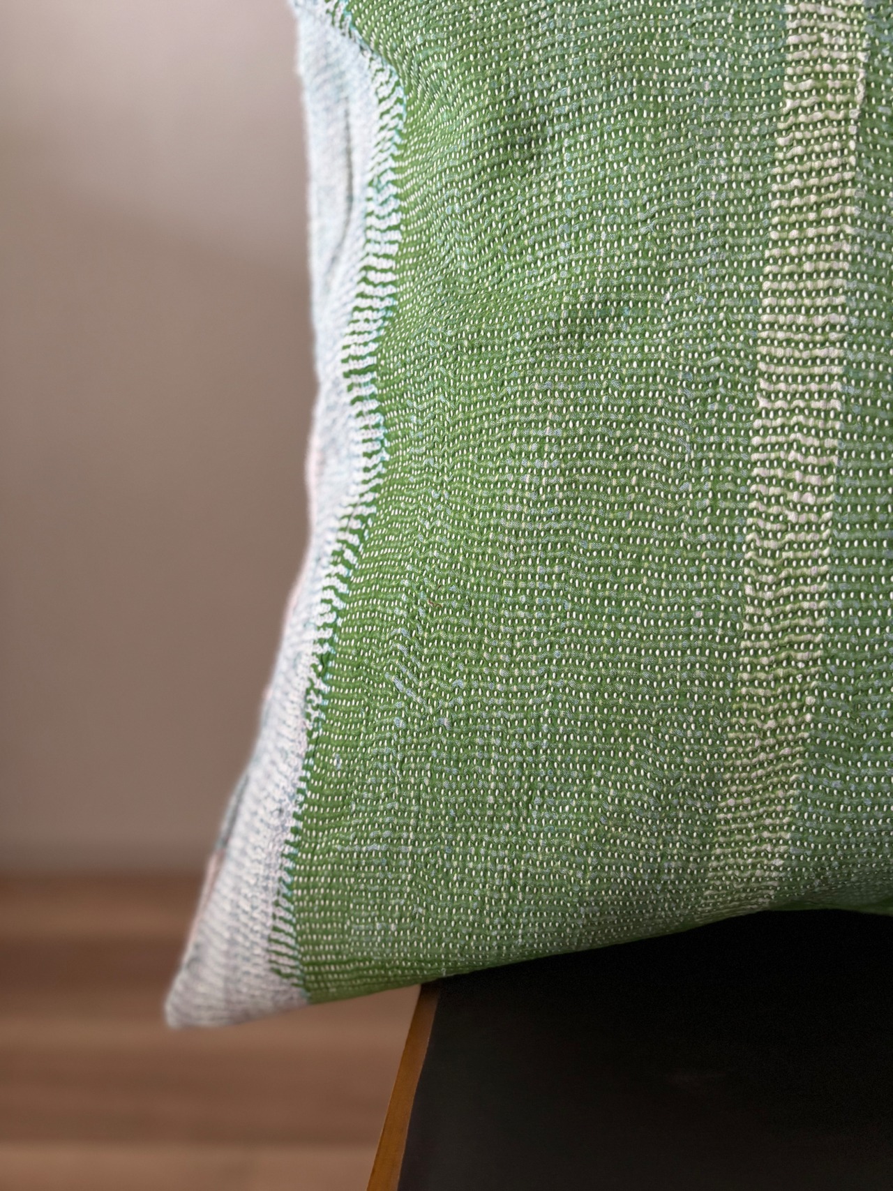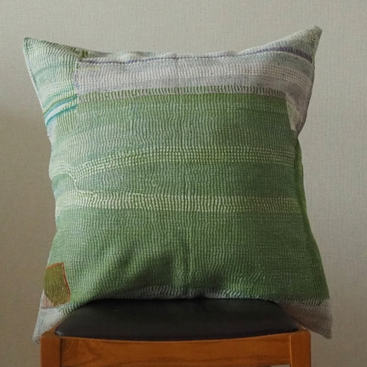 なかなか珍しい抹茶色をしたクッション。その色味と芸術的に細かい刺子が上品な雰囲気を醸し出しています。ところどころに現れる黄色のパッチワークもにくい。草原とレモネード、我ながら素敵なネーミングが思いついたと自画自賛しています。