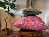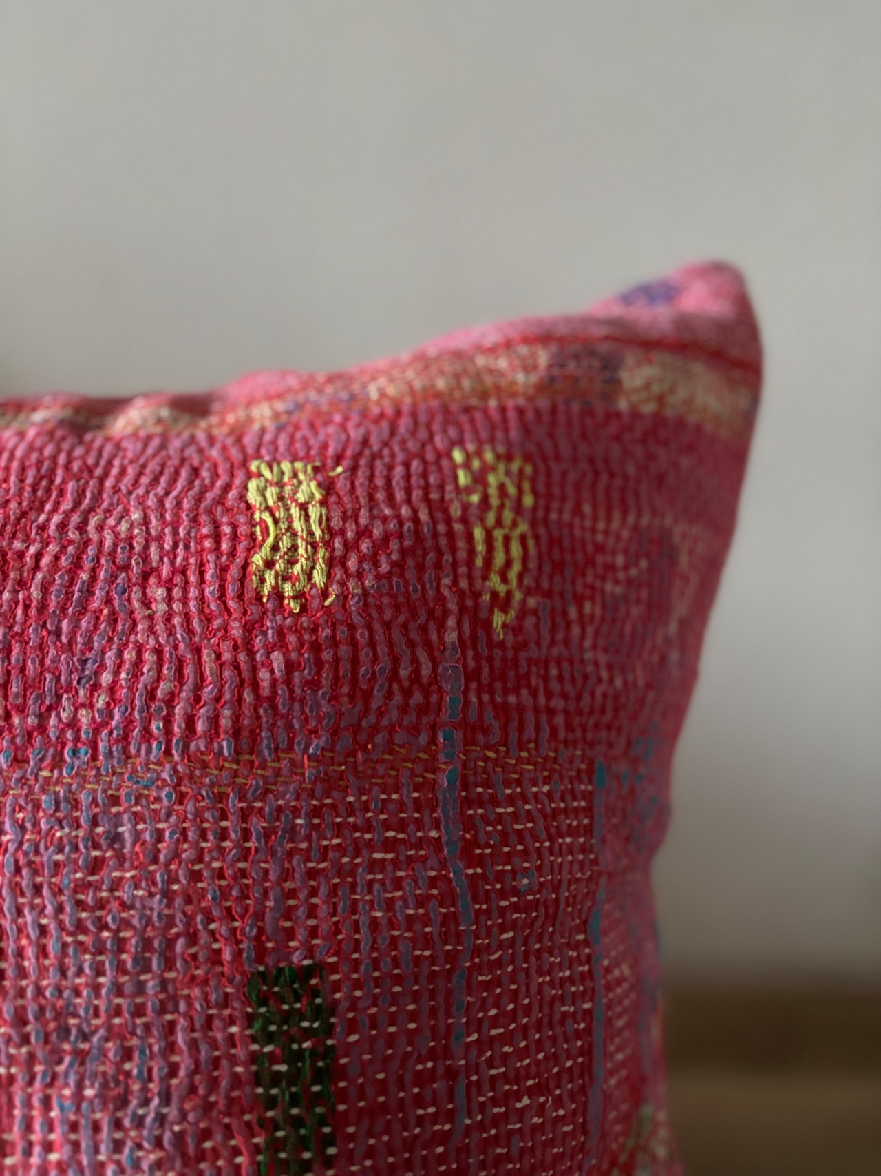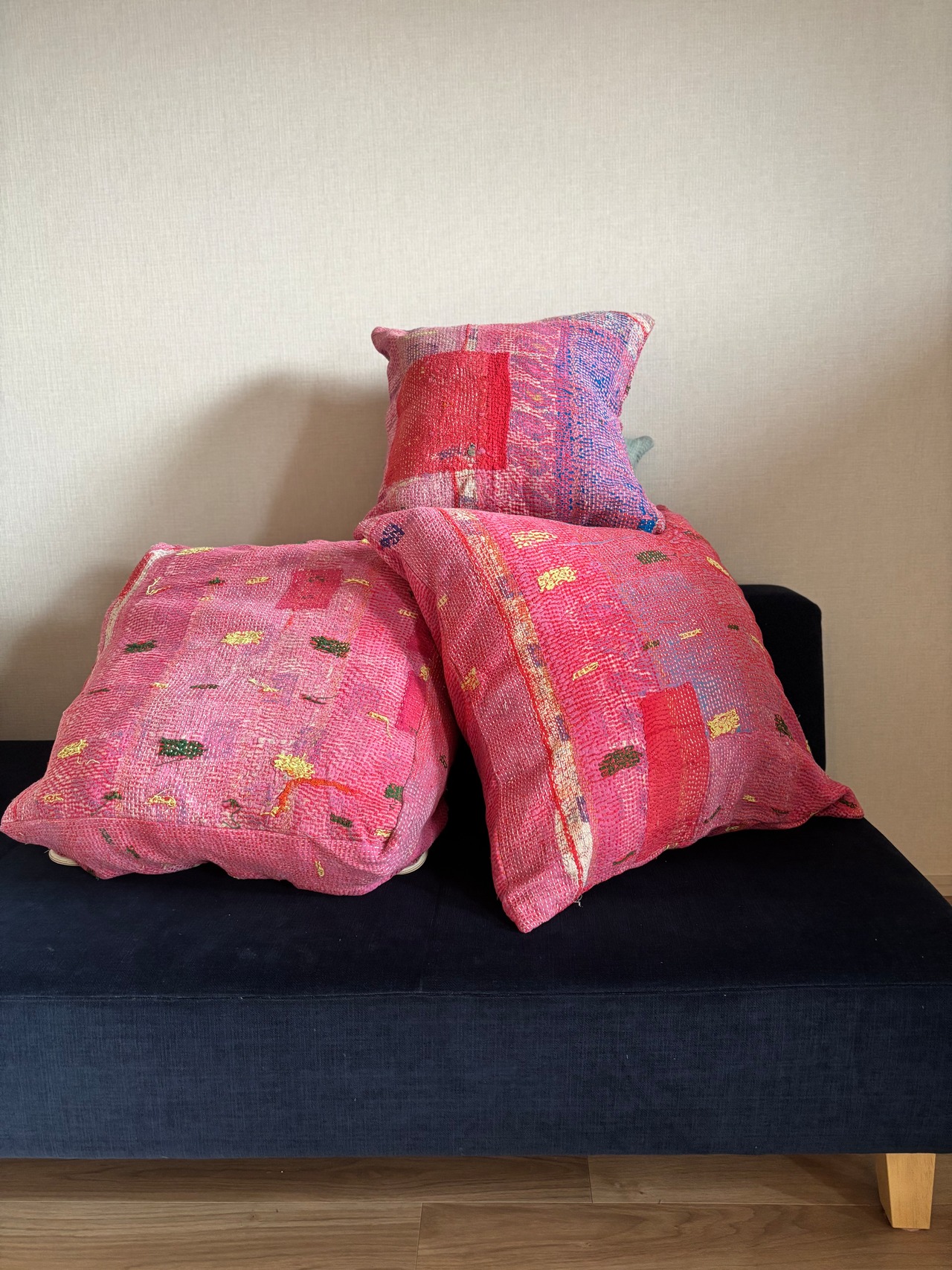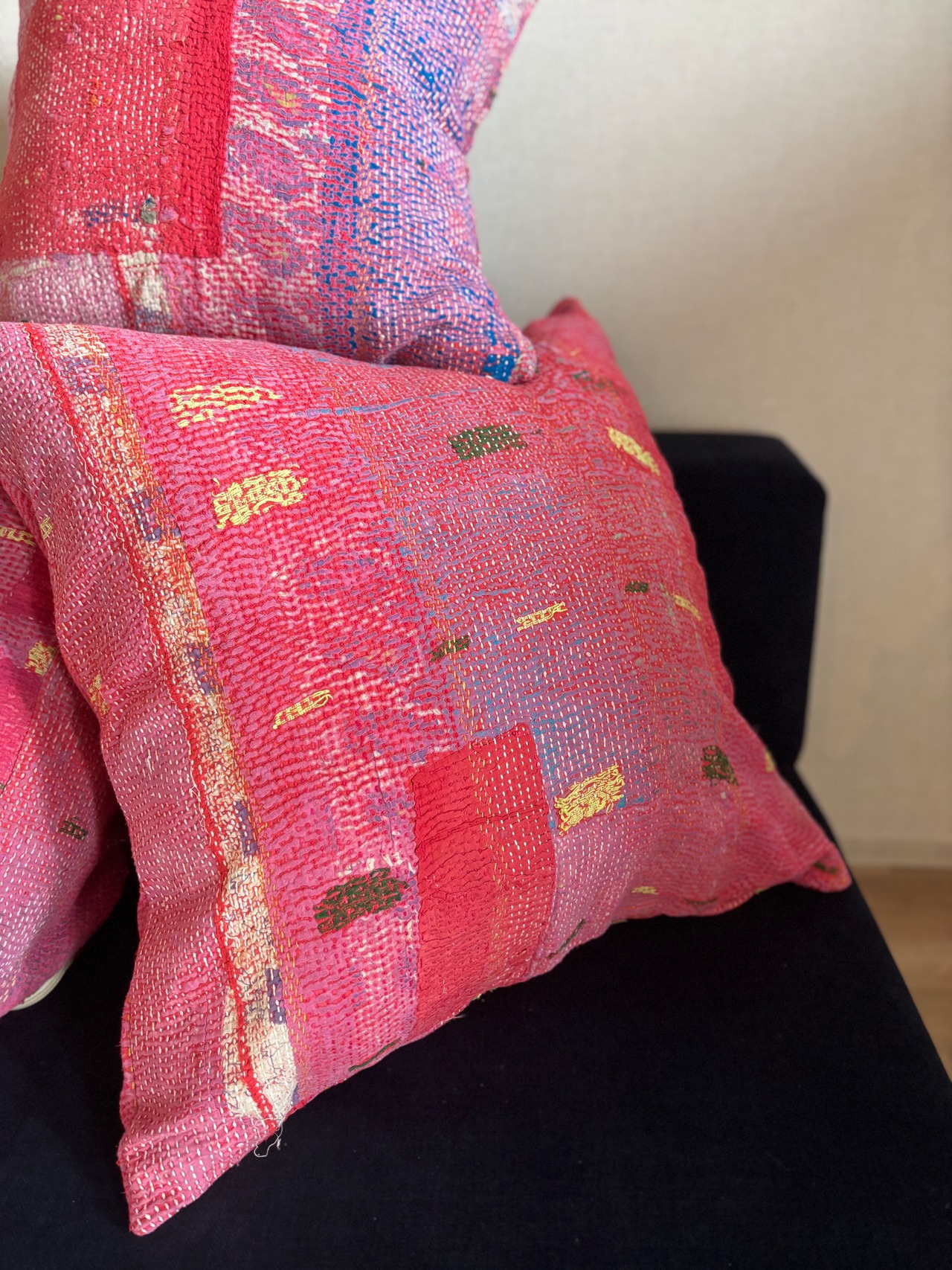 ビビットな明るいピンクを基調としたカンタキルトのクッションカバーが3タイプで仕上がりました!鮮やかな色合いは、空間に華やかさを加え、見る人の心を奪います。デザインはシンプルで、どんなインテリアにもスムーズに溶け込みます。毎日の生活に、明るいエネルギーをプラスする一枚です。