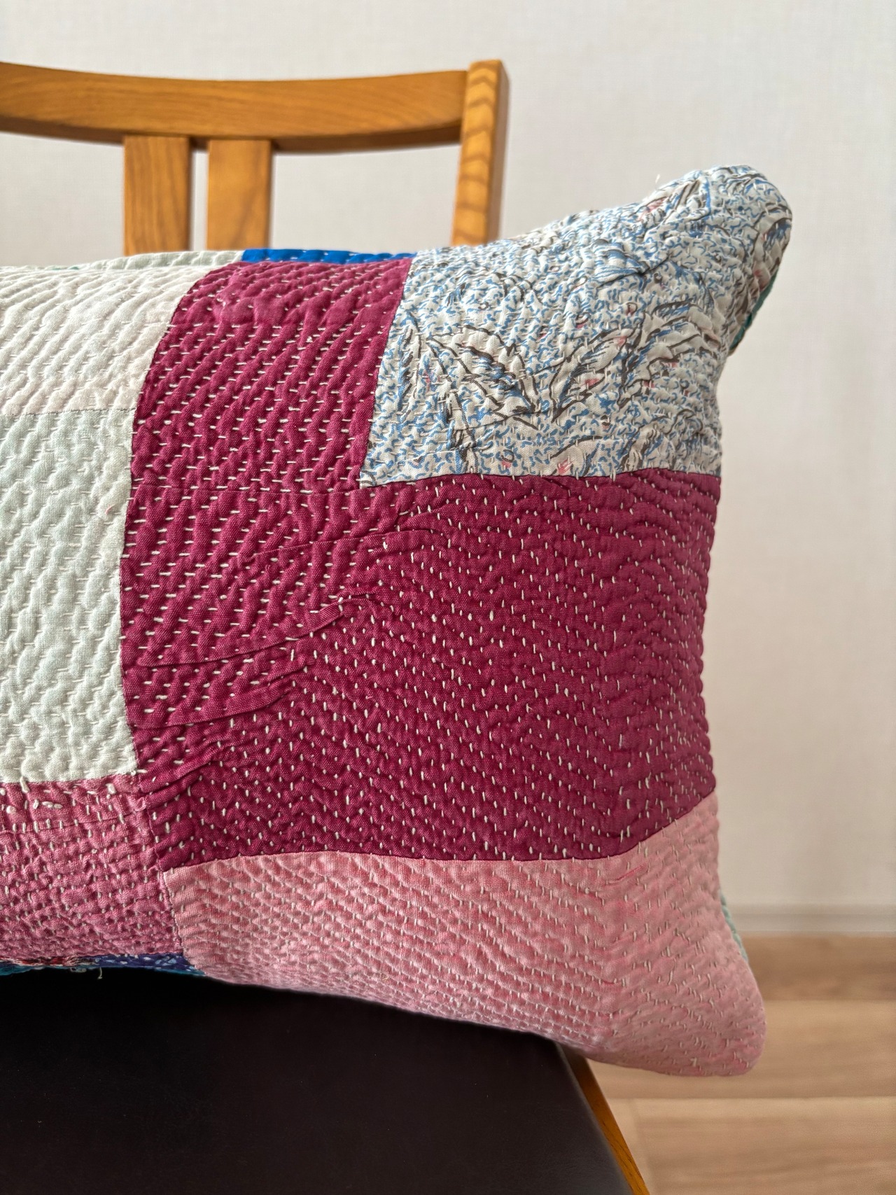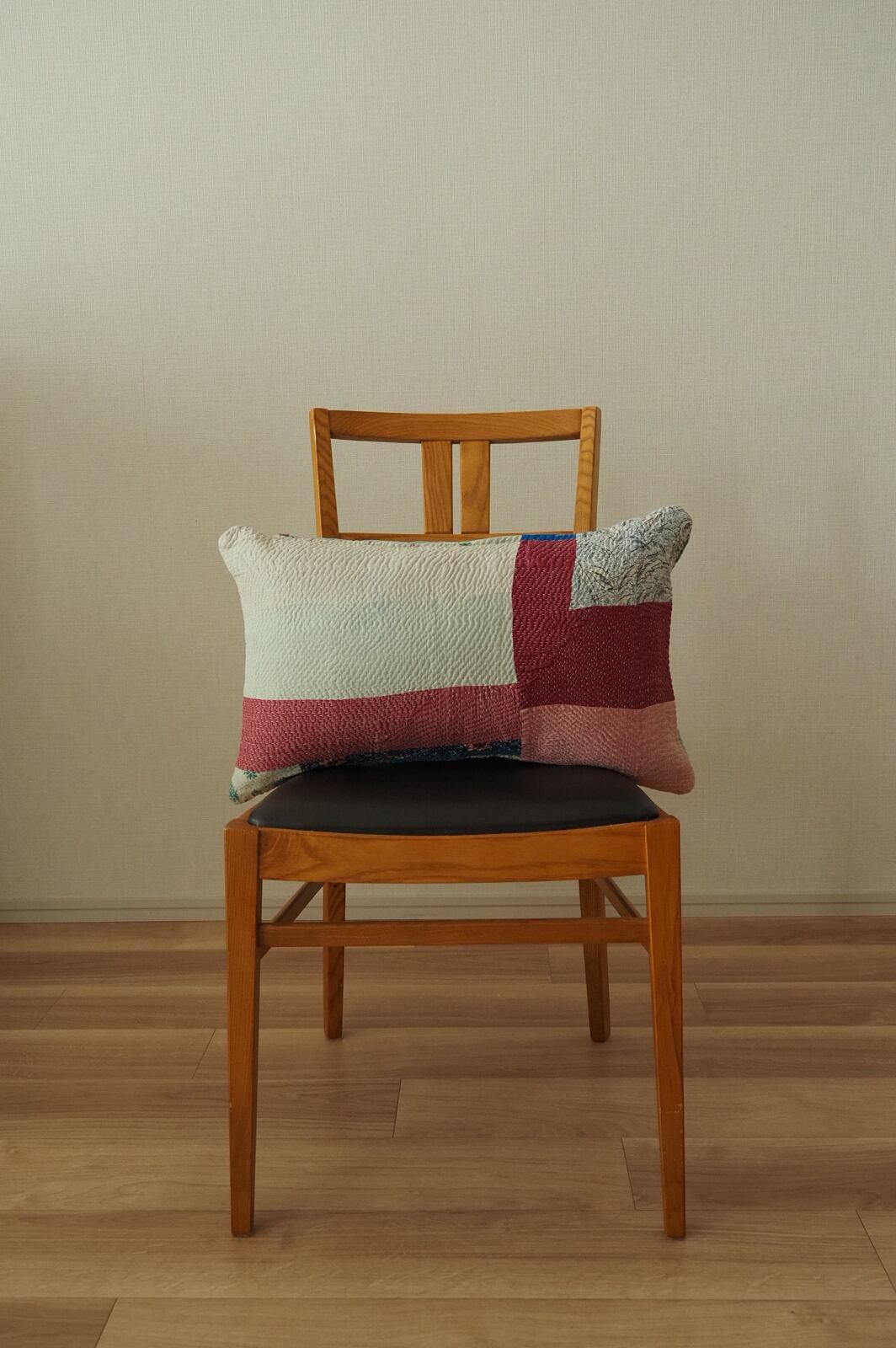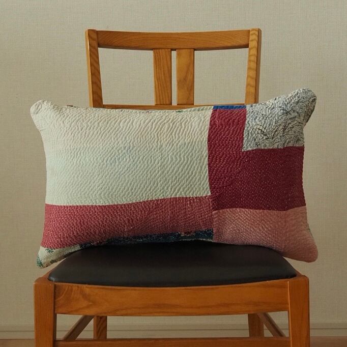 色の統一感やパッチワークの配置が大人っぽいコラージュ遊びをしているような1枚。枕型は使い勝手がよく一つはソファーに置いておきたい、そんな存在です。