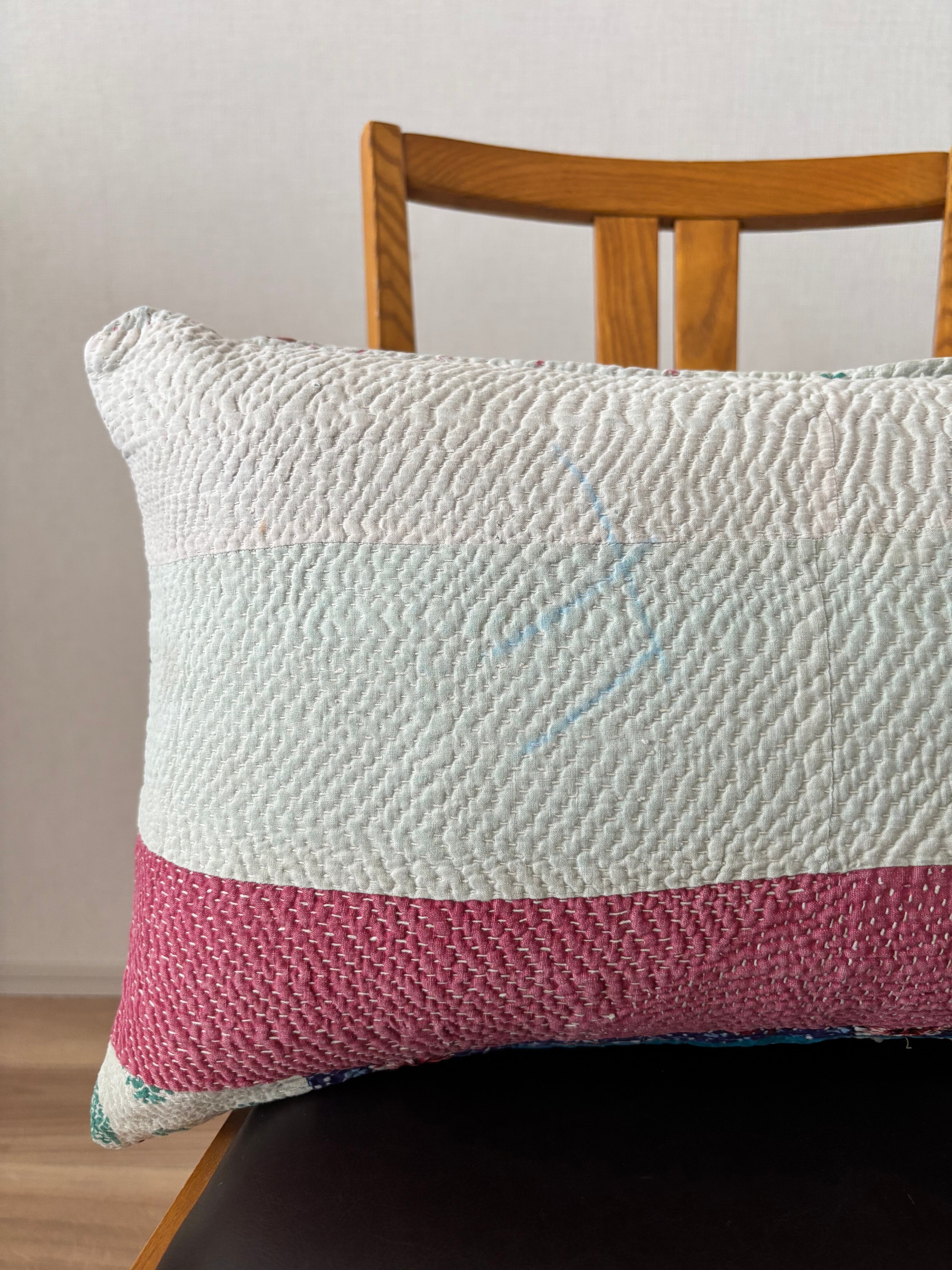 ヴィンテージのカンタキルトにはシミや色褪せ、傷みが見られますがそれもまたこの布の個性としてお楽しみ頂けると幸いです。糸の飛び出しがある場合はお好みに合わせてカットしてご使用ください。