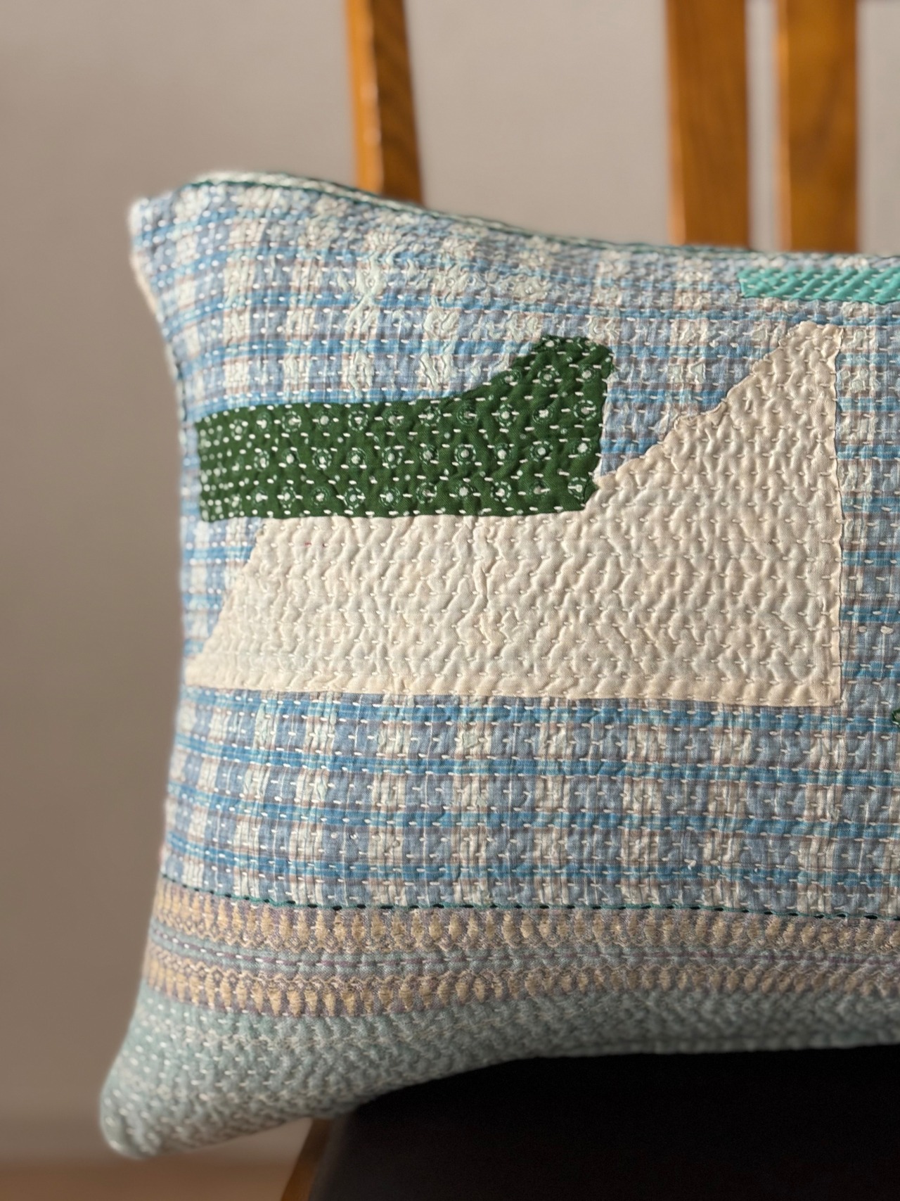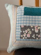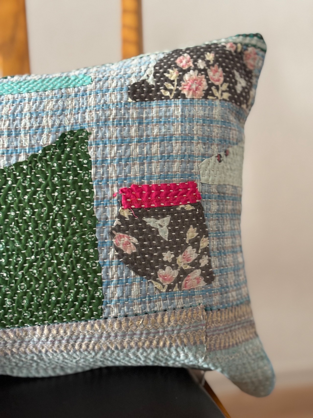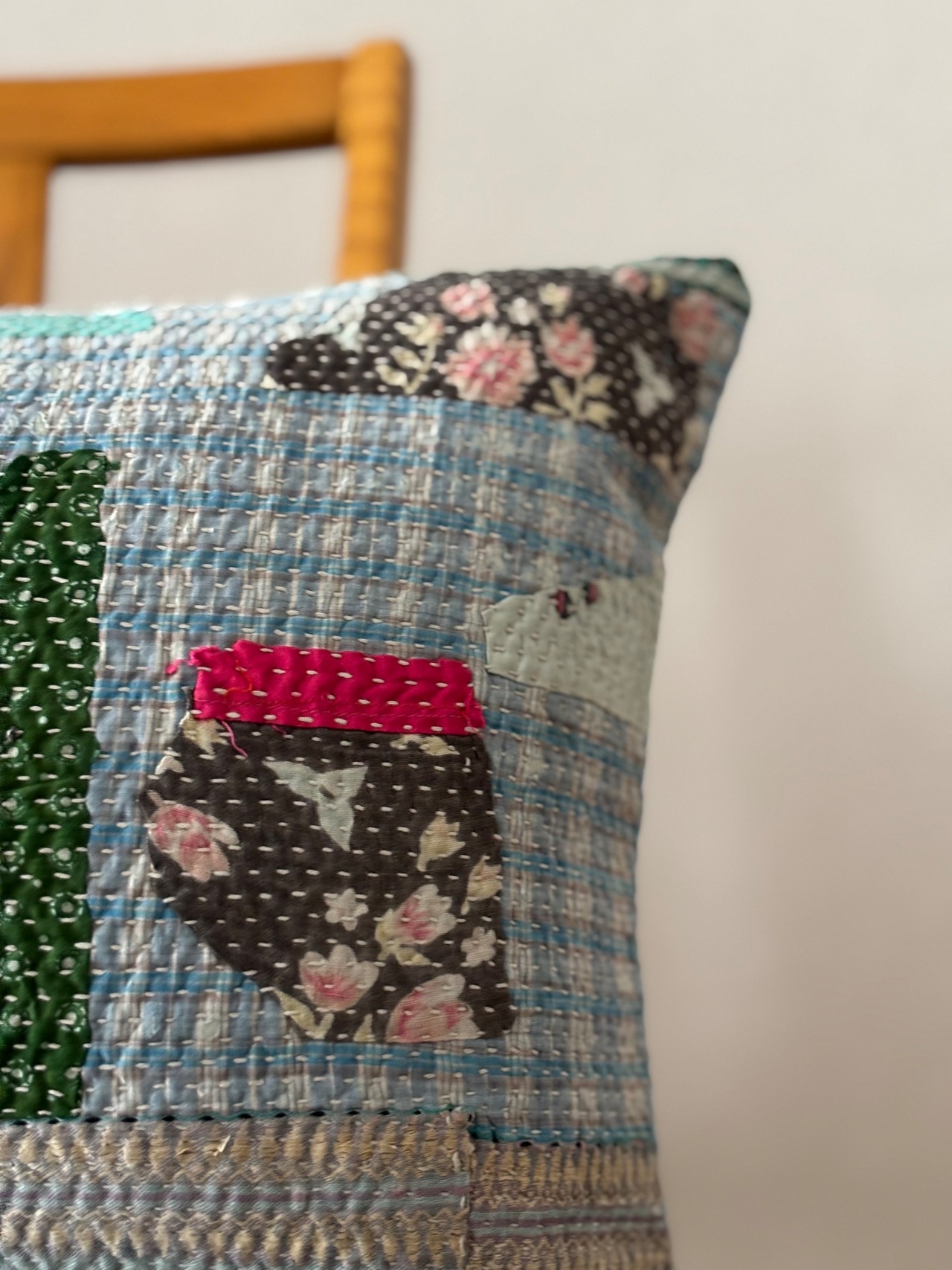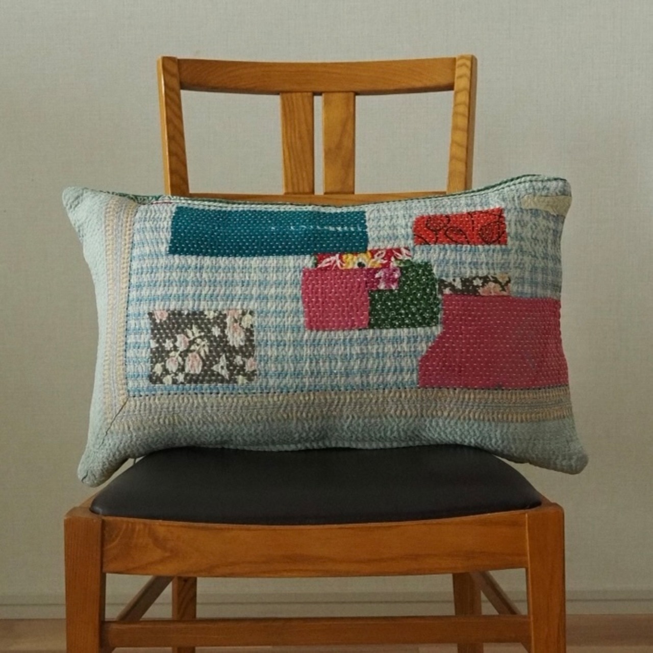 ランダムに配置されたパッチワークに遊び心を感じます。わいわい楽しそうなだけでなく、クッションの辺には大判のカンタキルトの淵が上手に配置されて、洒落た印象を演出してくれています。枕型は使い勝手がよく一つはソファーに置いておきたい、そんな存在です。