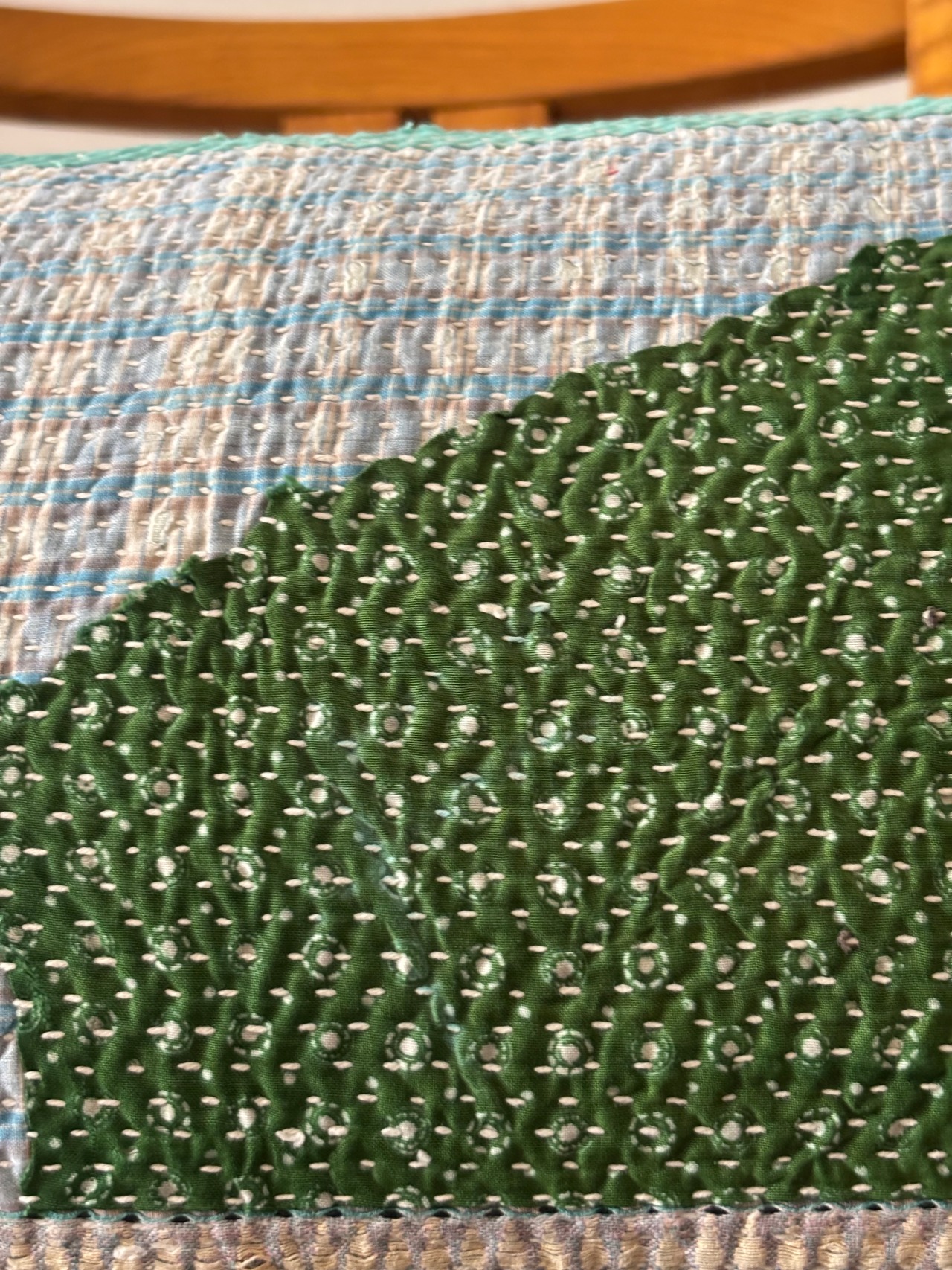 ヴィンテージのカンタキルトにはシミや色褪せ、傷みが見られますがそれもまたこの布の個性としてお楽しみ頂けると幸いです。糸の飛び出しがある場合はお好みに合わせてカットしてご使用ください。