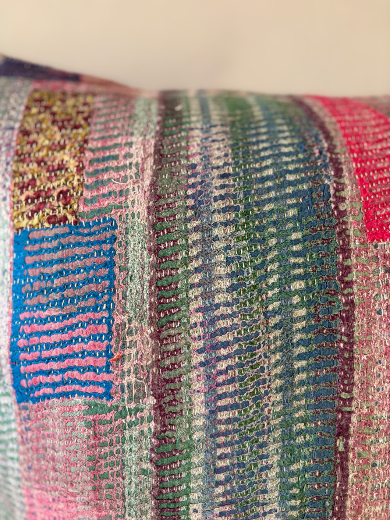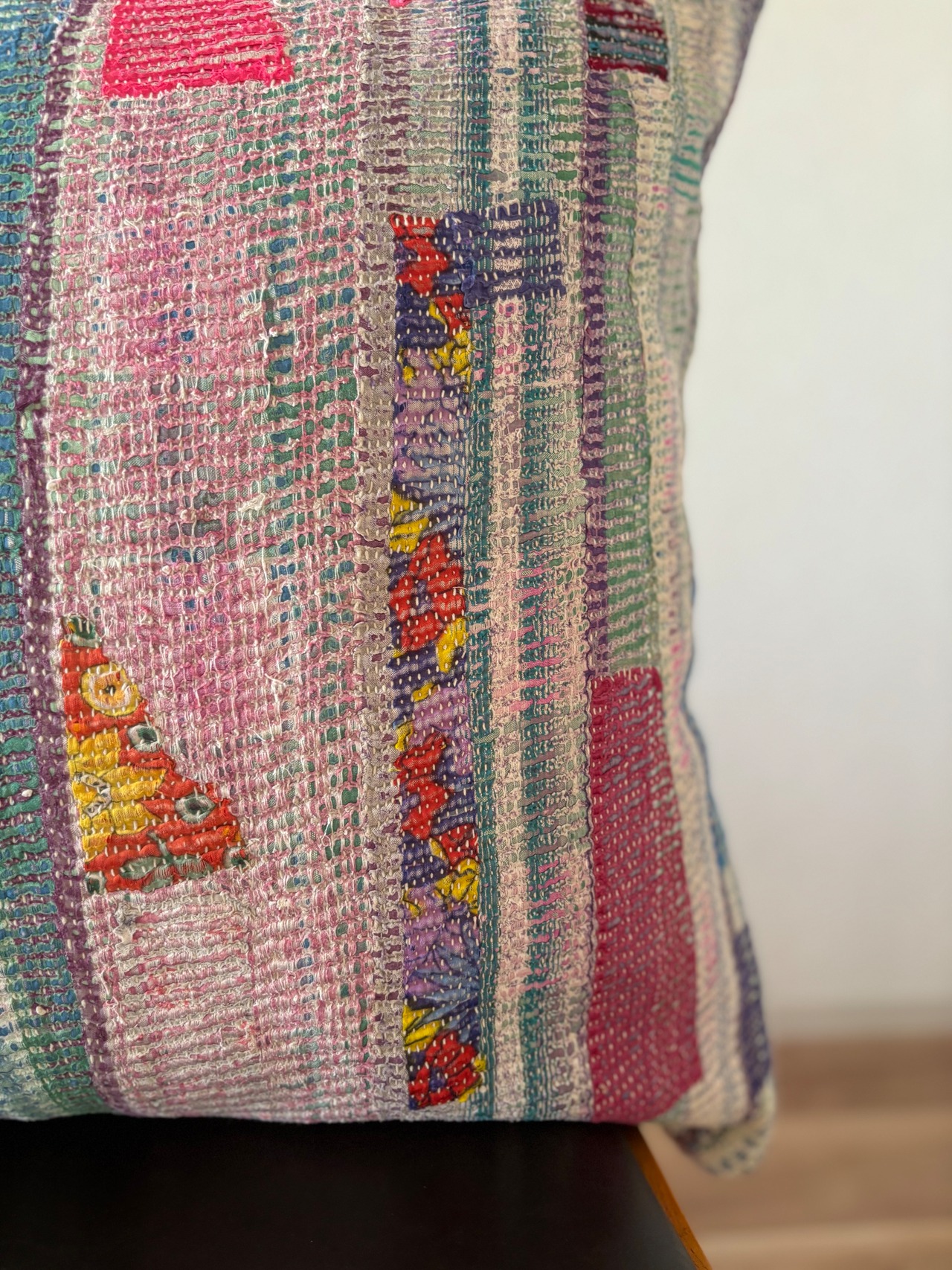 様々な形のカラフルなパッチワークが施されており、見るだけでわくわくフェスティバルに遊びに来たような気持にさせてくれるクッションカバーです。紫やピンクを基調とした美しいグラデーションに思わず目を奪われる、ずーーと眺めていられるようなカンタキルトです。