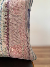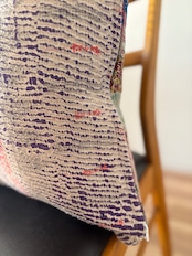 様々な形のカラフルなパッチワークが施されており、見るだけでわくわくフェスティバルに遊びに来たような気持にさせてくれるクッションカバーです。全体的にしっかりと擦れ感があり、それにより表現される複雑な色味をずーーと眺めていられるようなカンタキルトです。
