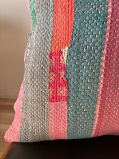 くすんだピンクとグリーン織りなすストライプがレトロでポップな雰囲気を演出しているクッションカバー。お迎え頂いた後もご使用いただく中で擦れの部分が徐々に増えてきます。カンタキルトの表情の変化を楽しむことが出来る育てがいのある生地です。