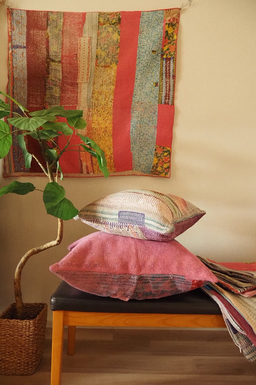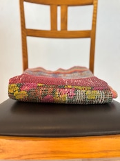 ヴィンテージのカンタキルトにはシミや色褪せ、傷みが見られますがそれもまたこの布の個性としてお楽しみ頂けると幸いです。糸の飛び出しがある場合はお好みに合わせてカットしてご使用ください。