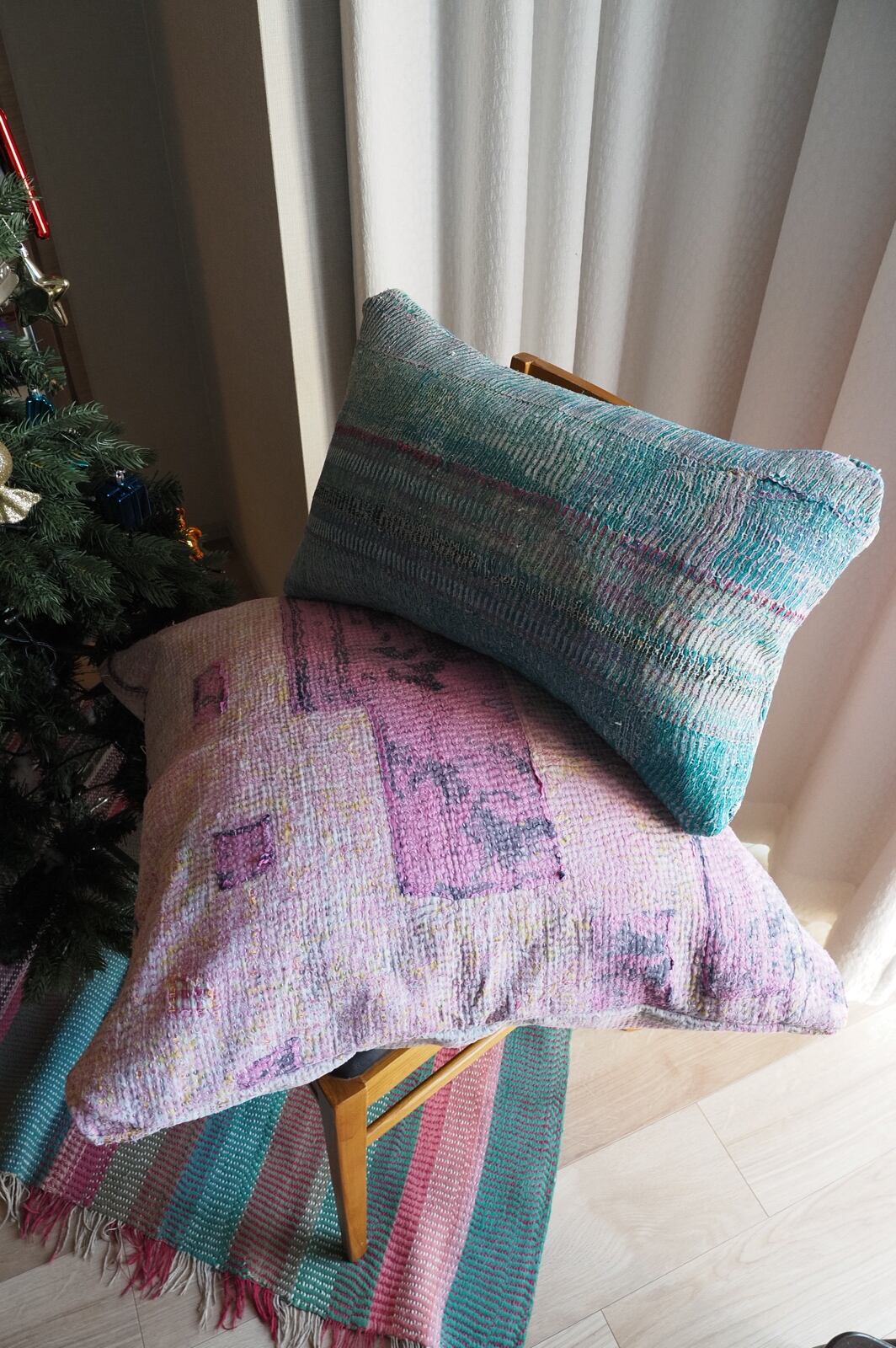 ヴィンテージのカンタキルトにはシミや色褪せ、傷みが見られますがそれもまたこの布の個性としてお楽しみ頂けると幸いです。糸の飛び出しがある場合はお好みに合わせてカットしてご使用ください。