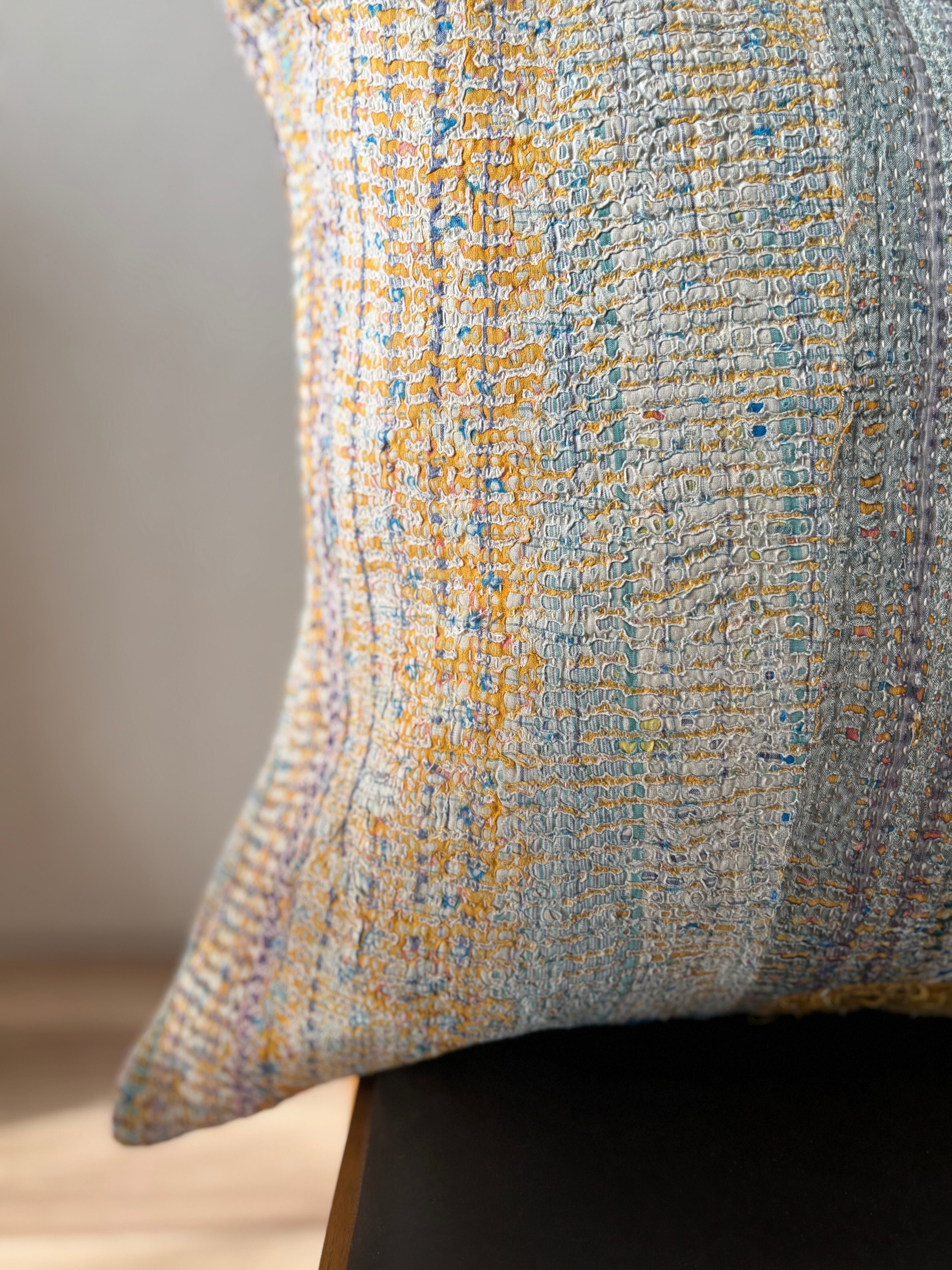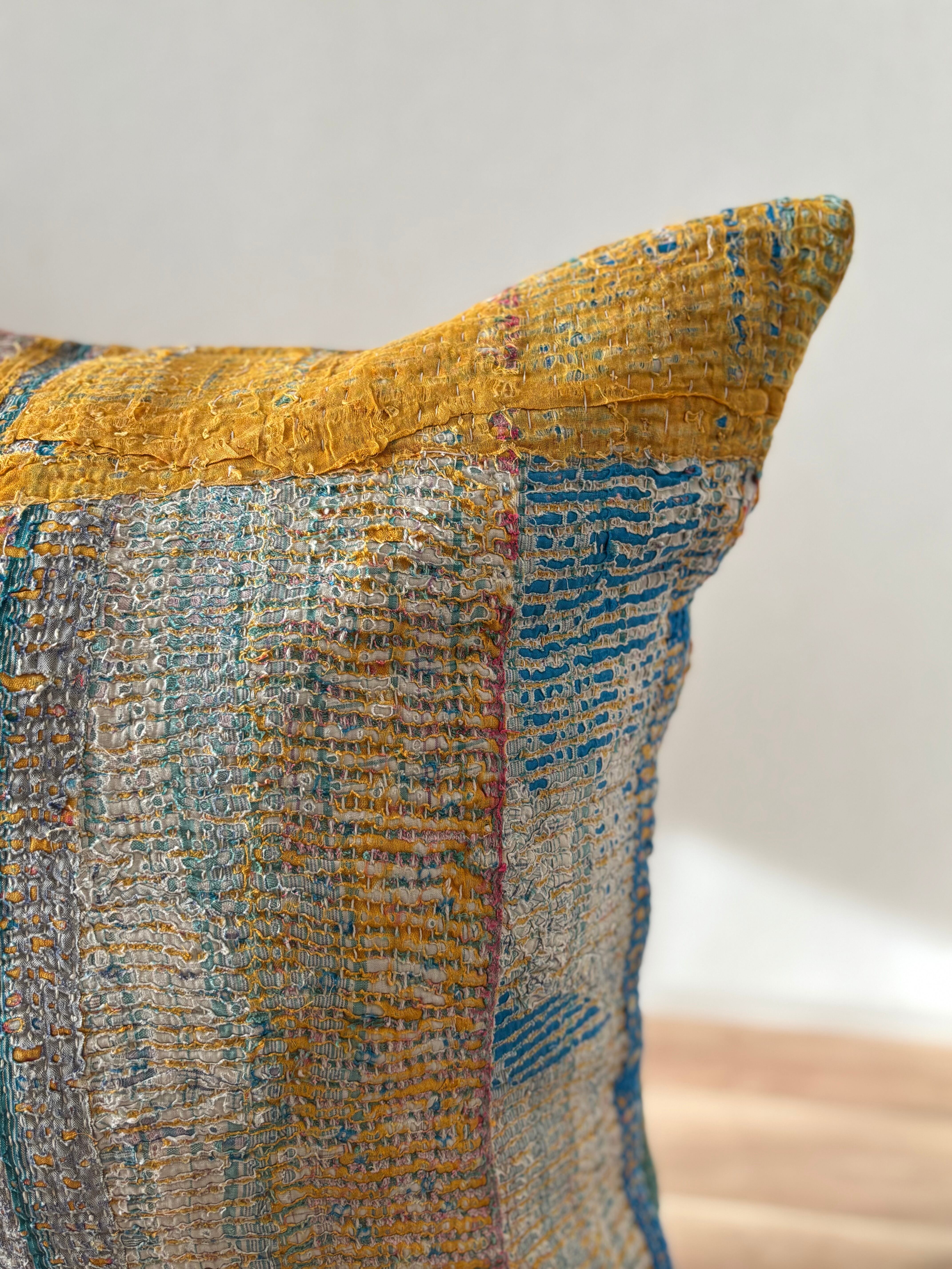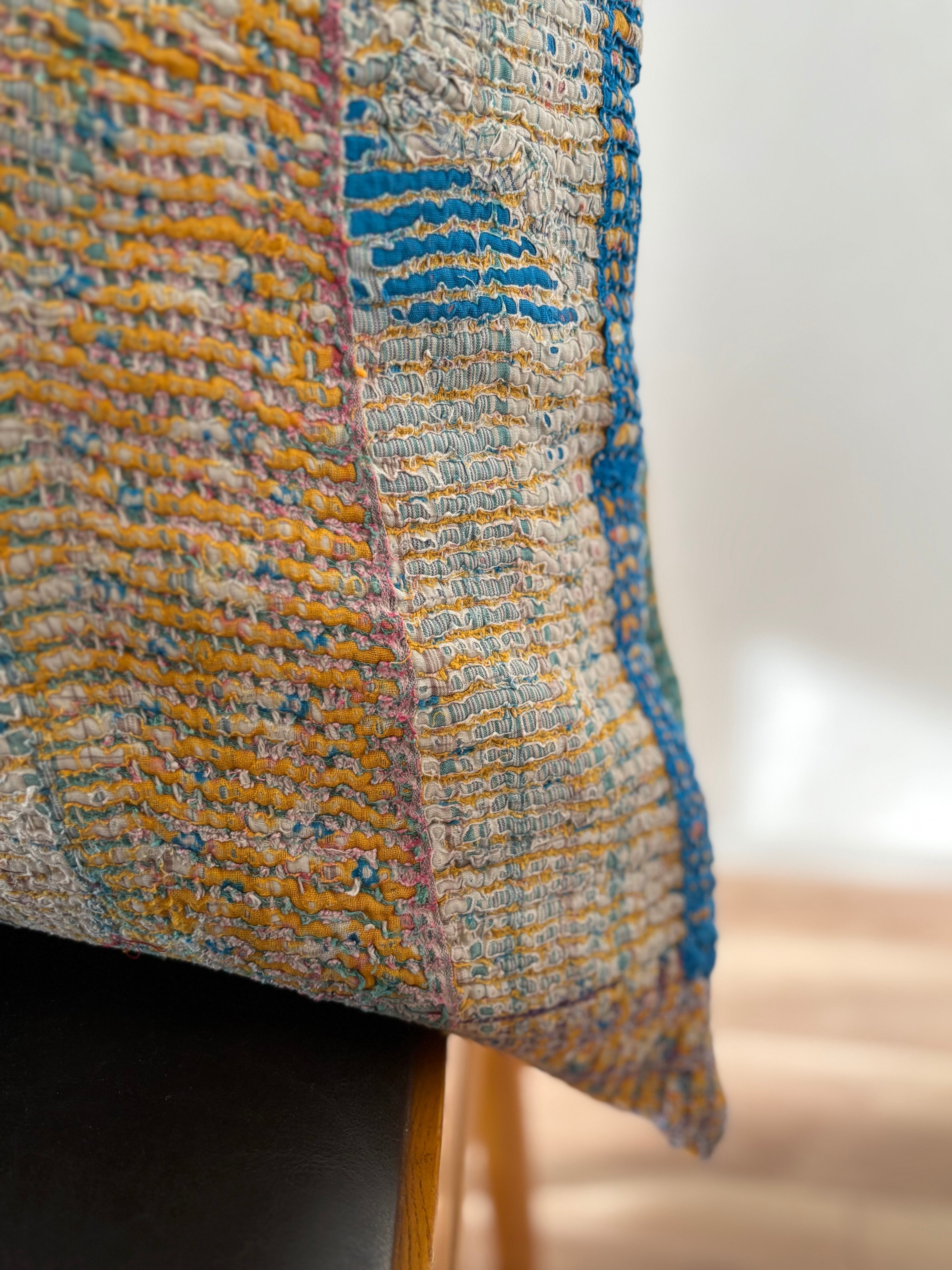 陽だまりのようなマスタードイエローを軸に、グレーやブルー、差し色のピンクが重なり合うクッション。花柄のパッチワークと太い刺し子が、異国の市場や古い家の記憶をそっと呼び起こします。